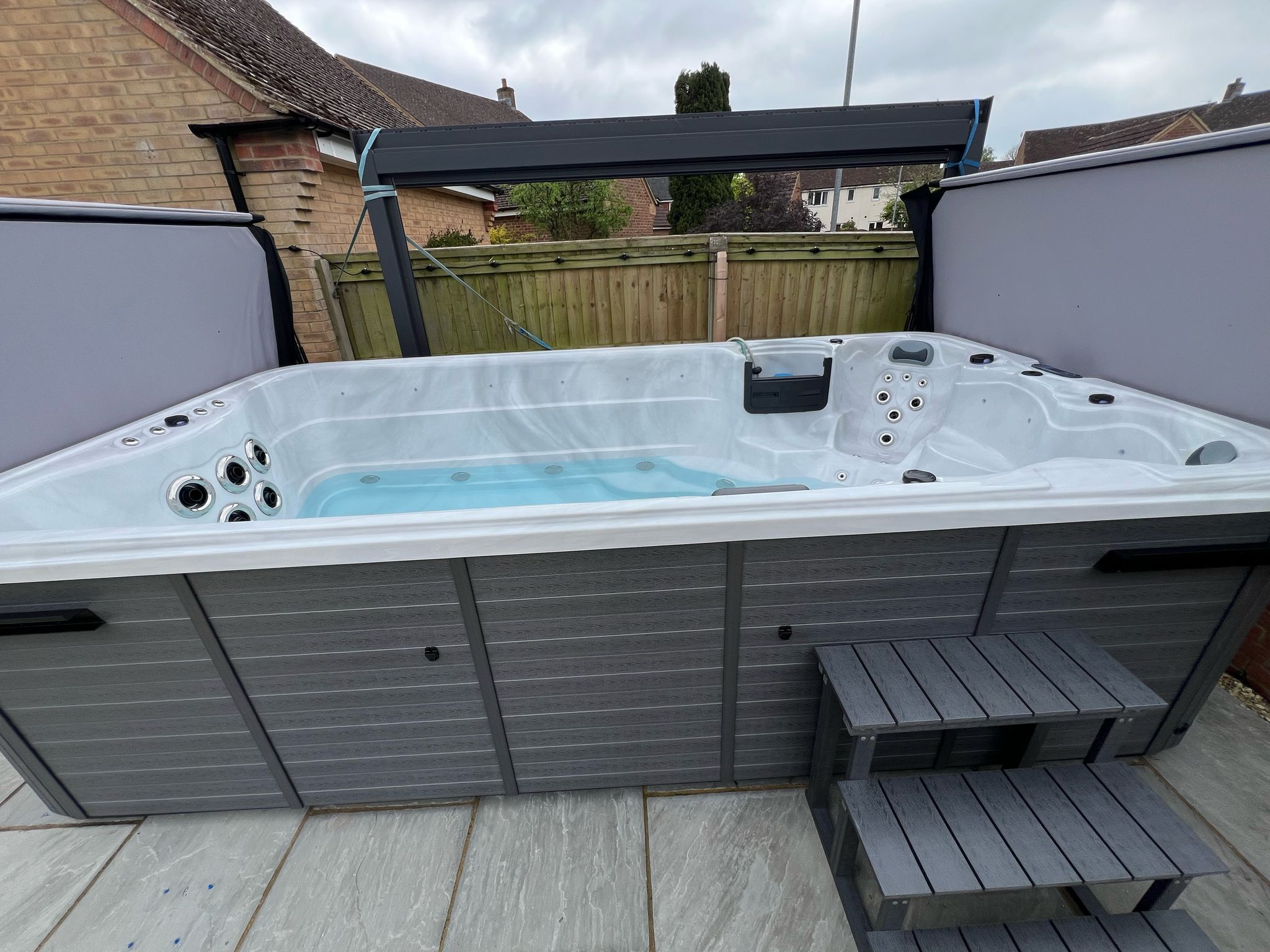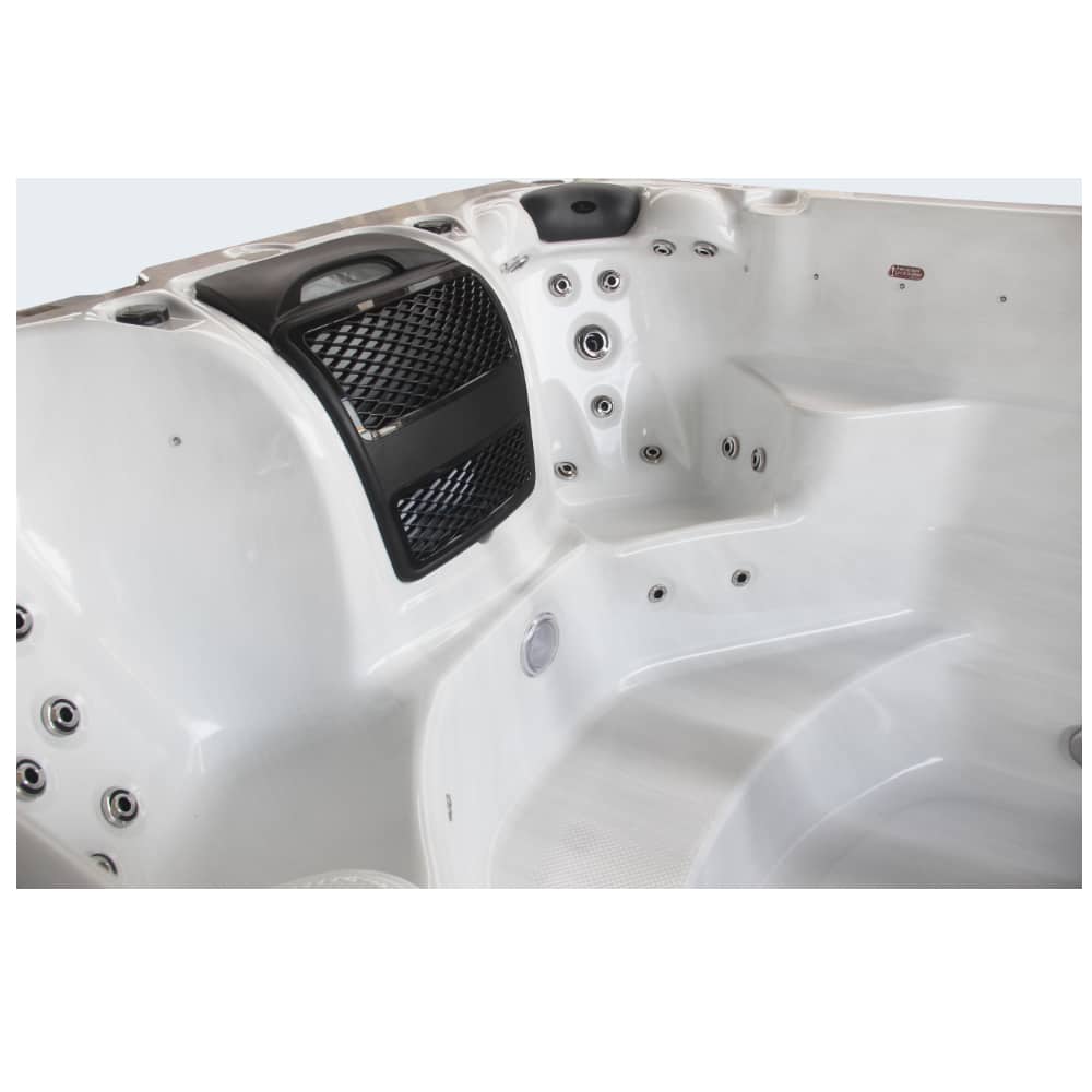 Standing at 4.3m long by 2.2m wide, this spa features a Gecko In.ye5 Control System, a 3Kw Gecko Heater and 3 stainless steel wide swim jets. It also houses 2 x 3.75HP Typhoon swim pumps and a 3Hp Typhoon Pump. As well as a 2HP seat jet pump, and a 0.5HP circulation pump. Its high-flow swim rate is 3600 LPM (litres per minute), with 30 hydrotherapy jets and an advanced Ozonator.
