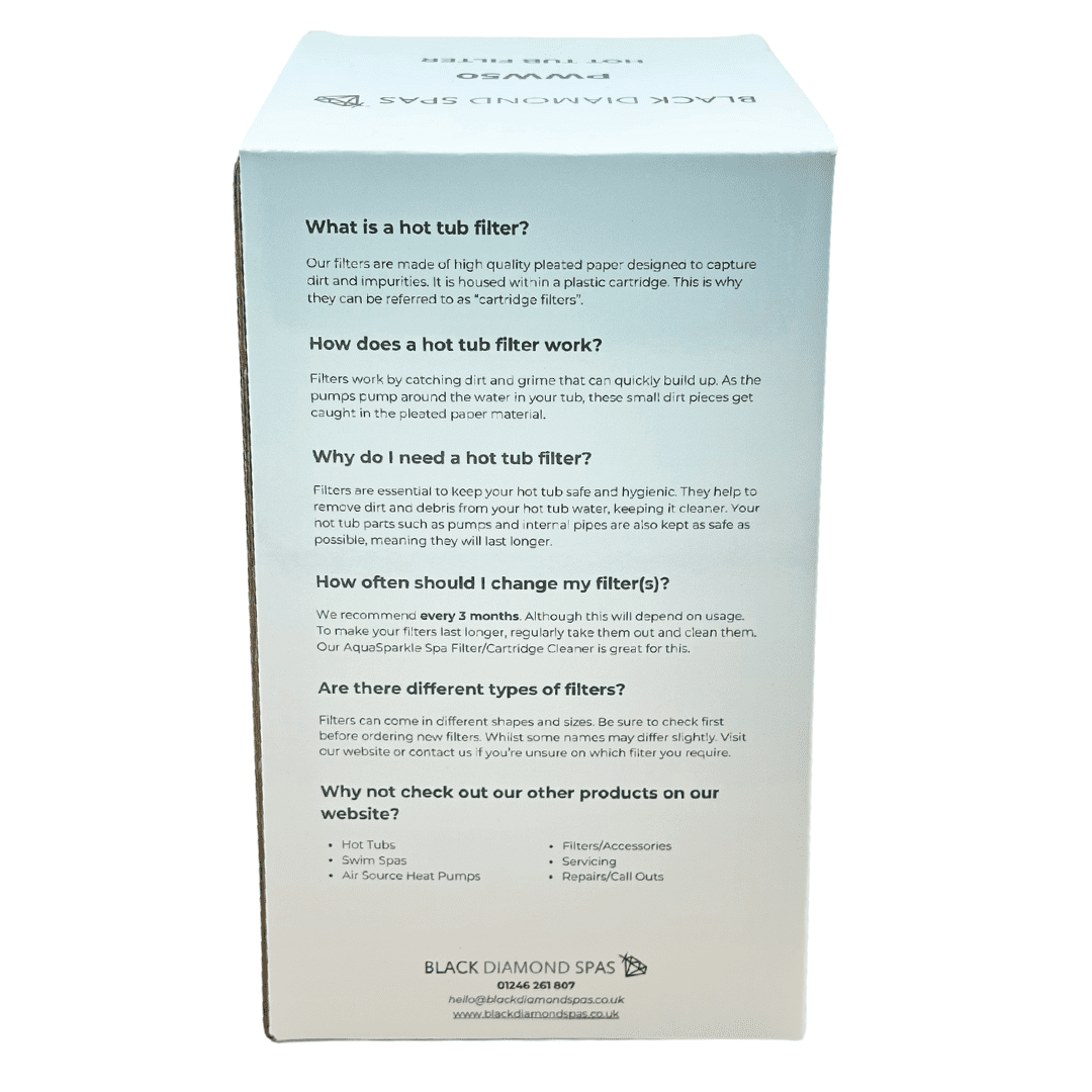 The PWW50 hot tub filter replacements are suitable for any hot tub which uses the PWW50 filter round or square thread at the bottom.