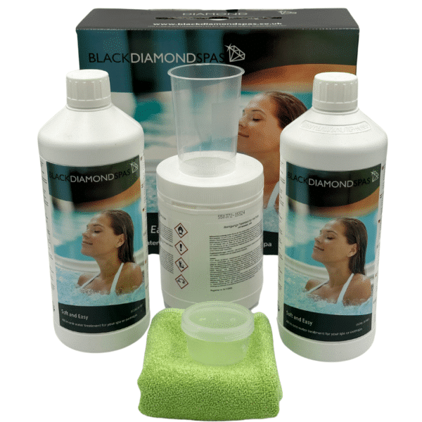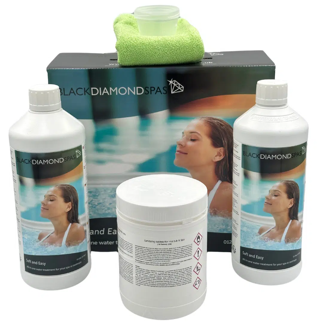 The Soft and Easy All in One Water Treatment Product is our most popular swim spa and hot tub chemical kit. Designed to be the upgrade to our chemical starter kit for hot tubs which come with every purchase of a new hot tub, it’s a quick and easy solution to balancing your hot tub or swim spa water. It helps to keep the water sanitised and safe and aims to last 3-4 months.